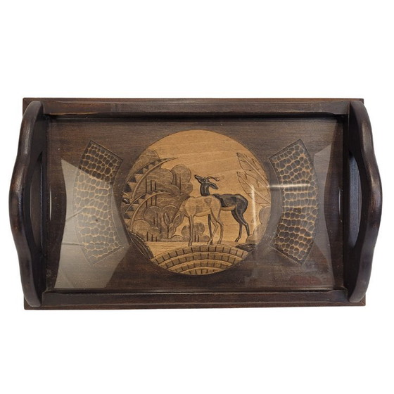 Tablett mit Antilopenschnitzerei, Holz, Art Deco, ps XX - Frankreich