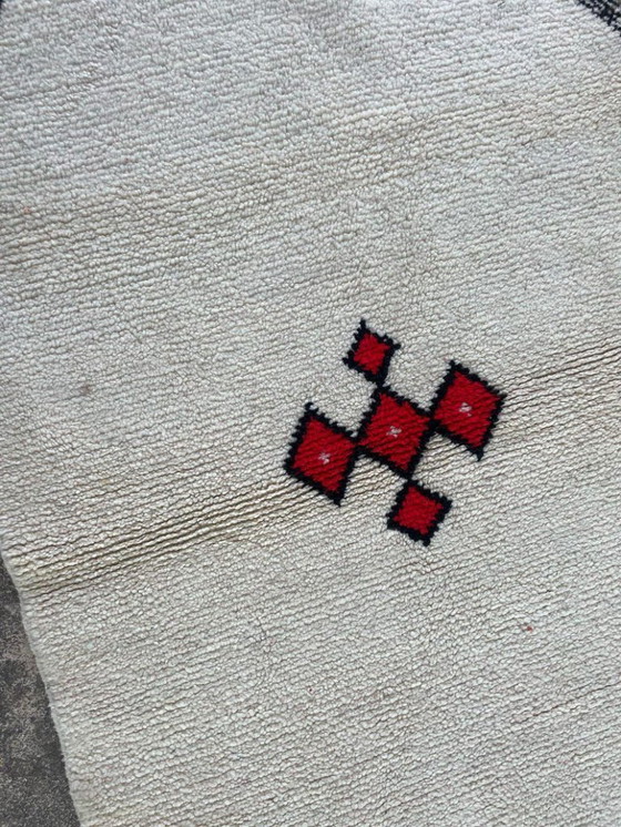Erleben Sie die zeitlose Eleganz dieses authentischen Beni-Mrirt-Teppichs, der aus feinster Wolle mit viel Liebe zum Detail gefertigt wurde. Sein kunstvolles Design mit einem markanten roten geometrischen Muster auf reinweißem Grund wird durch dezente schwarze Akzente ergänzt und macht ihn zum perfekten Mittelpunkt für jedes anspruchsvolle Interieur.