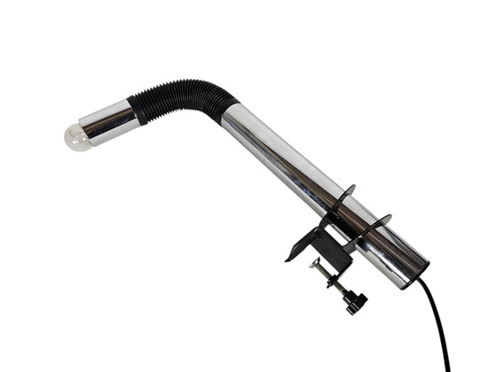 Hersteller: Targetti Sankey Designer: E. Bellini Zeitraum: 1950-1979 Material: verchromtes Metall und schwarzer Gummi Abmessungen: H. 24.41 in; T. 4.72 in; Diam. 2.17 / H. 62 cm; T. 12 cm; Durchm. 5,5 cm; Fassung: E27/220V -110V (inkl. Stecker und Ein-Aus-Schalter) Zustand: Ausgezeichneter, schöner Zustand von Chrom und Metall. Beschreibung: Bogenförmige Tischleuchte, entworfen von E. Bellini und hergestellt von Targetti Sankey in den 1970er Jahren. Die Leuchte besteht aus einem verchromten Metallrohr mit einem schwarzen Gummigelenk. Die Konstruktion bietet vollständige Flexibilität. Das schwarze Klemmelement, das den Sockel bildet, ermöglicht eine Höhenverstellung, während die Glühbirne in jede Richtung gedreht werden kann. Getestet und funktioniert einwandfrei. Beim Versand wird sie sorgfältig verpackt, um Schäden zu vermeiden.