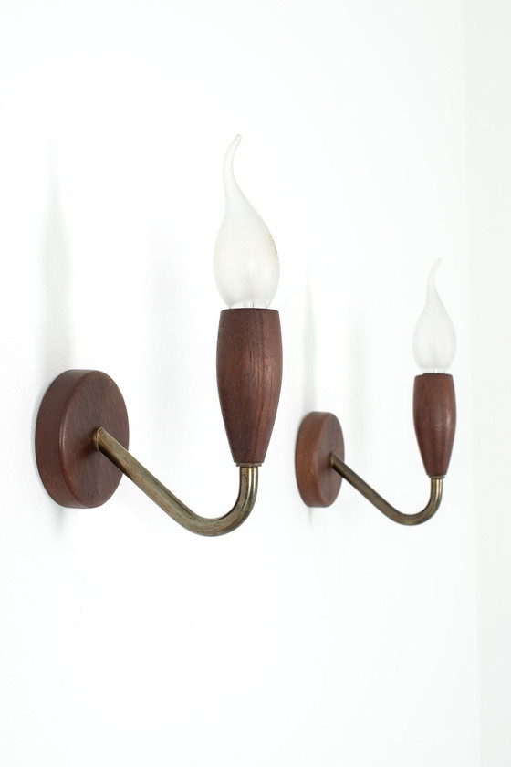 Teak-Wandlampen mit Messingbeschlägen. Die Lampen werden als Set ohne Leuchtmittel verkauft. Guter Vintage-Zustand.