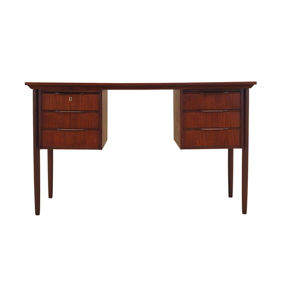 Die Struktur und die Platte sind mit Teakholzfurnier bedeckt. Die Beine sind aus Massivholz gefertigt, perfekt in die Konstruktion des Schreibtisches integriert. Die Oberfläche ist aufgefrischt. Die Vorderseite des Schreibtisches hat sechs geräumige Schubladen. Kein Schlüssel enthalten.