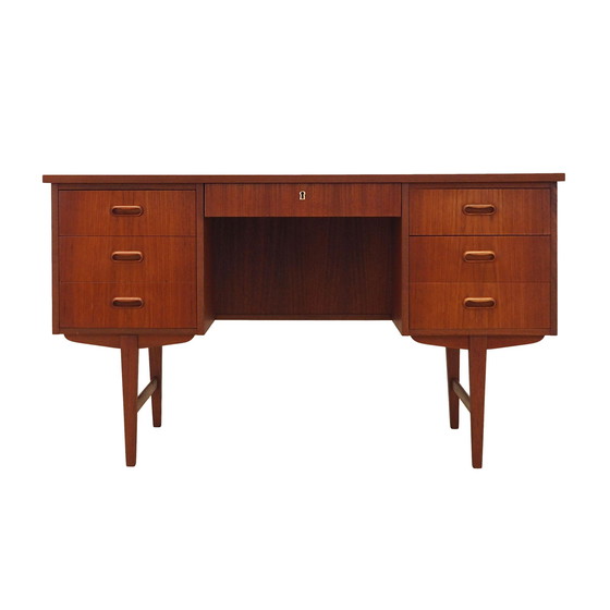 Die Struktur und die Platte sind mit Teakholzfurnier bedeckt. Die Beine sind aus Massivholz, perfekt in die Konstruktion des Schreibtischs integriert. Die Oberfläche ist aufgefrischt worden. Auf der Vorderseite des Schreibtisches befinden sich sieben praktische Schubladen. Auf der Rückseite des Möbels befindet sich ein geräumiges Regal. Kein Schlüssel enthalten.
