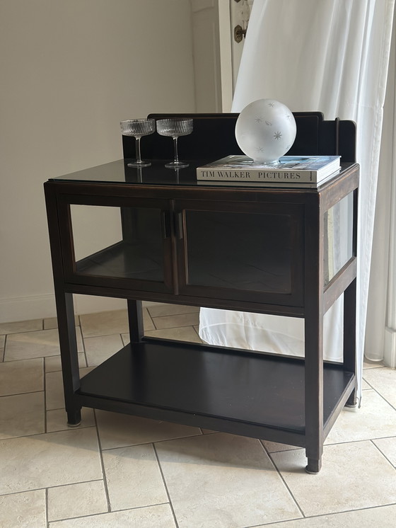 Der Stil der Amsterdamer Schule fasziniert immer wieder aufs Neue. Er ist elegant und ausdrucksstark, ohne dabei protzig zu wirken. Dieser wunderschöne Art-déco-Teeschrank im charakteristischen Stil der Amsterdamer Schule ist da keine Ausnahme. Von den geometrischen Formen am erhöhten Rand bis hin zu den Griffen sind die Details dezent hervorgehoben. Offiziell ein Teeschrank, eignet er sich auch hervorragend als Barschrank, Flurschrank oder Kommode. Die Glasplatte ist noch vorhanden und schützt das Holz vor den Teetassen.