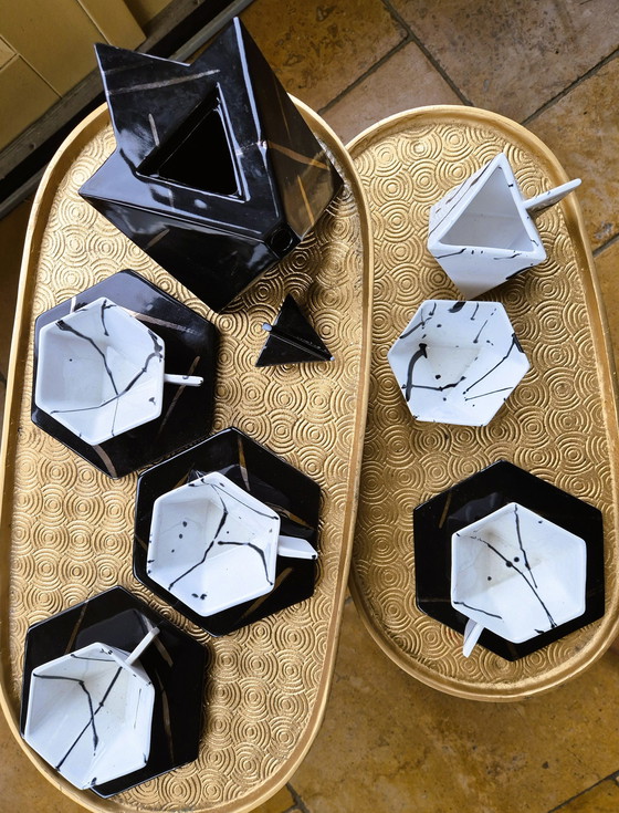Ein schönes und seltenes sechseckiges Teeservice, leider unsigniert. Wahrscheinlich in den 1980er Jahren in Schweden von Rolf Sinnemark für Rörstrand entworfen und hergestellt. Das glasierte Porzellan- oder Steingutservice hat sechseckige und dreieckige Formen, die ihm ein Art-déco-Aussehen verleihen. Es ist mit goldfarbenen Streifen auf der Teekanne und den Untertassen verziert. Das Set besteht aus einer Teekanne, vier Tassen, vier Untertassen, einem Milchkännchen und einer Zuckerdose. Es ist in tadellosem Zustand. Die Maße der Teekanne sind B 18 cm, L 13 cm, H 16 cm. Ein ähnliches Service wurde kürzlich in Deutschland für 1250 € versteigert.