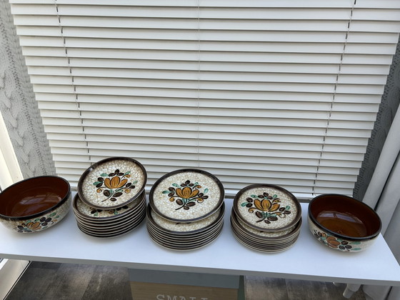 Set von Boch-Tellern, 9 flache, 9 tiefe, 9 kleine, und zwei Schüsseln. Mod "CORFOU" cat vintage. In perfektem Zustand, in einem Schrank gelagert, stammt aus den 60er Jahren.