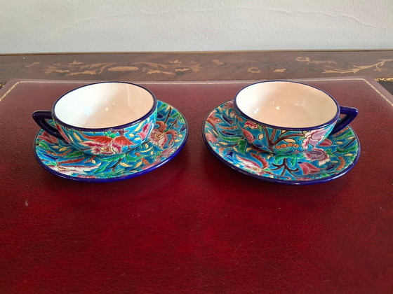 Ein harmonisches Set aus zwei Longwy-Emaille-Teetassen mit Untertassen, jedes Stück ein kleines Kunstwerk.