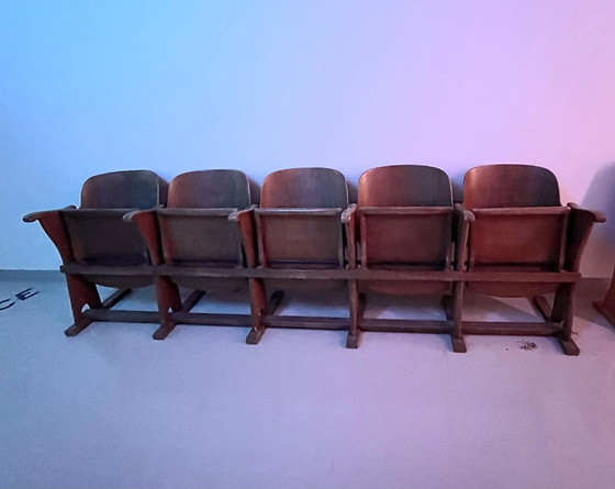 Ein seltener Fund: eine Reihe von 5 Original-Theaterstühlen aus dem Mid Century, wahrscheinlich aus den 1950er Jahren. Diese Vintage-Stühle tragen das authentische Thonet-Logo und zeigen die zeitlose Eleganz, für die die Marke bekannt ist.