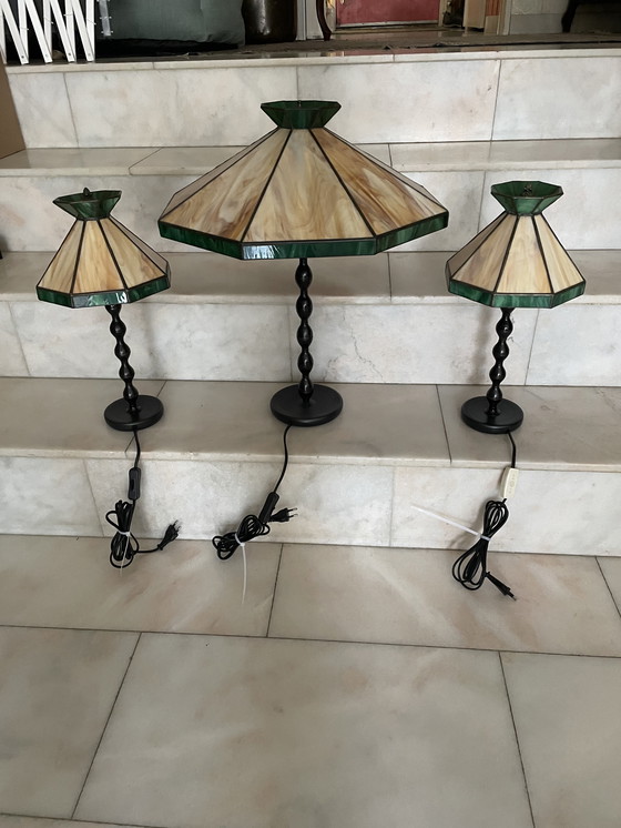 Erhellen Sie Ihre Räume mit der zeitlosen Eleganz dieser Tiffany-Glaslampen. Jede Lampe besticht durch einen wunderschön gearbeiteten Schirm in harmonischen Grün- und Beigetönen, der ein warmes und einladendes Licht erzeugt. Das filigrane Glasdesign wird durch einen robusten Metallfuß ergänzt, der Langlebigkeit und Stil vereint.