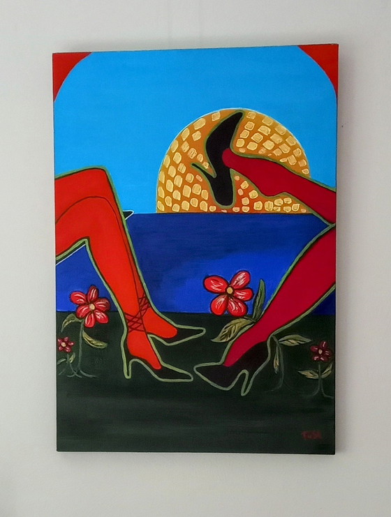 Modernes, neues, einzigartiges, fröhliches, farbenfrohes Acrylbild, seitlich bemalt. Tineke van Steenbergen malt große abstrakte Bilder und ungewöhnliche Porträts. Sie hat viele Ausstellungen gemacht und Preise gewonnen. Ihre Arbeiten sind in den Niederlanden, Belgien und Deutschland beliebt. Website www.tinekevansteenbergen.eu