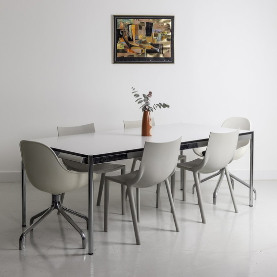 USM Haller T59 Rechteckiger Tisch USM Möbel wurden von einem visionären Architekten und einem Industriellen entworfen und werden seit über 50 Jahren in der Schweiz hergestellt und sind weltweit anerkannt. Ihre hochwertige Verarbeitung und ihre zeitlosen Linien machen sie zu einem unverzichtbaren Designklassiker, der sowohl in Büros als auch in den schönsten Innenräumen, ob klassisch oder modern, seinen Platz findet. Abmessungen: - Länge: 200 cm - Tiefe: 100 cm - Gesamthöhe: 74 cm - Höhe des Gestells: 67 cm Material: - Verchromter Stahl