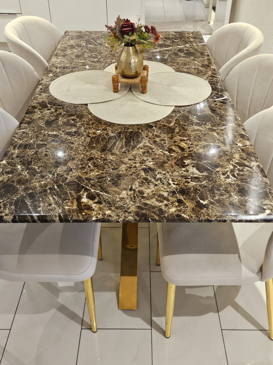 Dieses wunderschöne Esszimmer-Set vereint Eleganz mit modernem Design und ist die perfekte Ergänzung für jedes Esszimmer. Der Tisch besticht durch eine imposante Marmorplatte in einem satten Braunton, die von einem markanten goldenen Metallgestell getragen wird und Ihrem Interieur einen Hauch von Luxus verleiht.