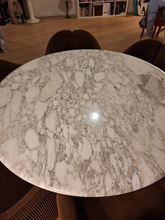 Originaler Marmor-Esstisch T69 von Osvaldo Borsani, gefertigt aus Arabescato Cervaiole Marmor, kombiniert mit 6 Sesseln PS142 von Eugenio Gerli, bezogen mit braunem Cord und mit Rollen (siehe meine andere Anzeige).