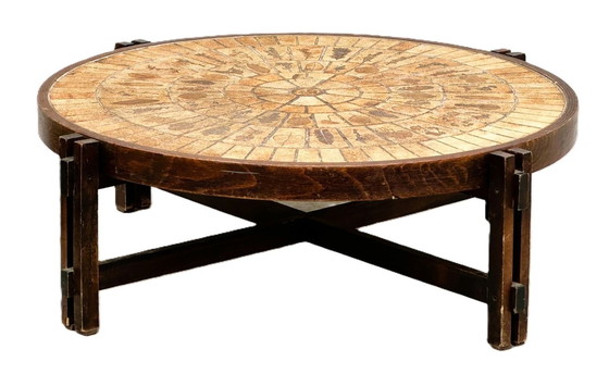 Wir präsentieren den exquisiten Couchtisch Table Basse Capron, ein Meisterwerk, das die Eleganz des Mid-Century-Modern-Designs verkörpert. Dieser von dem renommierten Designer Capron gefertigte Couchtisch besticht durch eine atemberaubende Keramikplatte mit filigranen Mustern, die zeitlose Kunstfertigkeit ausstrahlen. Die warmen Braun- und Beigetöne harmonieren perfekt mit dem edlen Holzgestell und schaffen eine stimmige Materialkombination, die jeden Wohnraum bereichert.