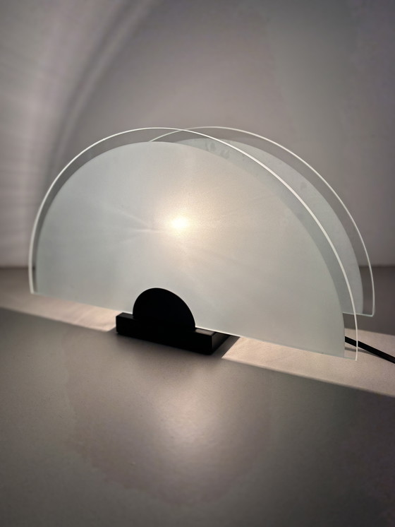 Erleben Sie die Eleganz der Glas-Tischleuchte im Art-déco-Stil der 1980er-Jahre. Dieses exquisite Stück fängt die Essenz des Art-déco-Designs perfekt ein: Die schlanke, geschwungene Glasstruktur streut das Licht sanft und schafft so eine warme und einladende Atmosphäre.