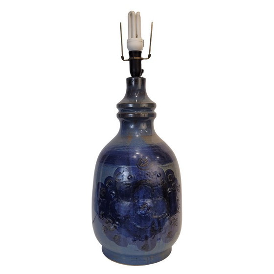 Wunderschöne Tischlampe der dänischen Firma Hanne Stentøj, 1960er Jahre. Sie ist aus glasierter Steinzeugkeramik mit geometrischem Muster in verschiedenen Blau- und Erdtönen und mit einem abstrakten Muster, sowohl in Relief als auch gemalt. Er fügt sich in den stilistischen Rahmen des modernen skandinavischen Designs ein.