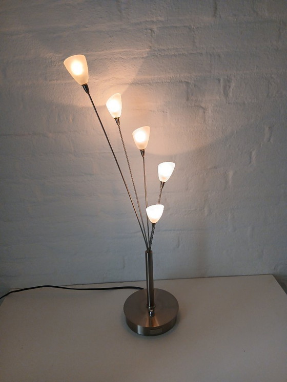 Vintage Strauß "Schneekelche/Tulpen" von Jan des Bouvrie für Boxford. Wunderschöne Lampe , schön gebürstetem Edelstahl mit milchig weißen Glas Kelche. In gepflegtem Vintage-Zustand , gut funktionierend , sehr leichte Gebrauchsspuren , siehe Fotos . Auf der Basis der Lampe hat einen Dimmer, um die Lichtintensität nach Ihren Wünschen einzustellen, der Dimmerknopf hat leichte Gebrauchsspuren, (siehe Fotos). Diese Lampe passt sowohl zu retro/vintage Interieurs als auch zu modernen Interieurs. Fabrikation: Boxford Designer: Jan des Bouvrie Modell: YLCM304 Höhe: 68 cm Fuß: Rund 15,5 cm. Steuerung: Dimmer am Sockel Lichtquelle: Halogenlampen, 5 Stück G4 10W Kabellänge: 170 cm Gewicht: 1,75 kg