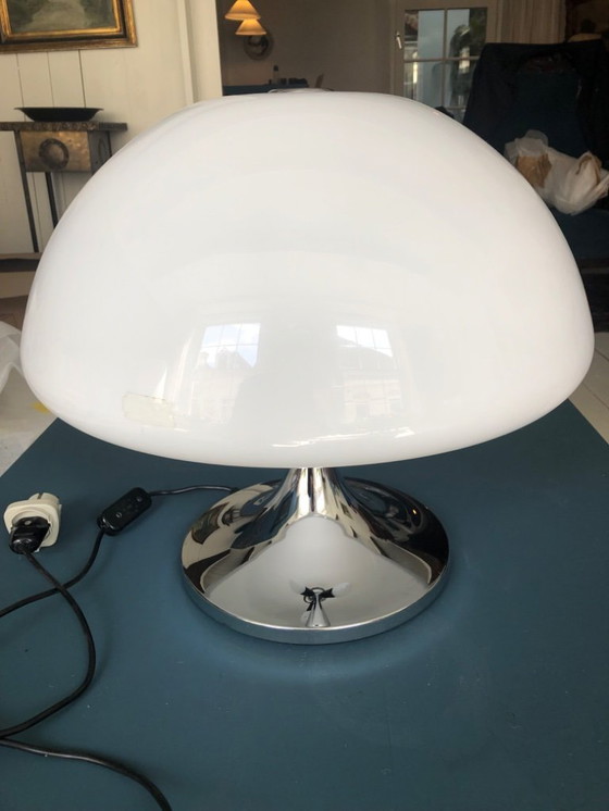 Tischleuchte Toledo des Designers Luigi Massoni, hergestellt von Guzinni in Italien. Die Lampe wurde zwischen 1970 und 1979 hergestellt. Der Schirm ist aus weißem Acryl, was die Leuchte leicht macht. Was die Lampe besonders schön macht, ist die Reflexion der Glühbirnen im silbernen Sockel. Ich habe die Lampe 2008 gebraucht in Zürich in einem Designgeschäft gekauft. Der Steckertyp ist aus der Schweiz, aber ein Adapter für das niederländische oder belgische Stromnetz wird mitgeliefert.