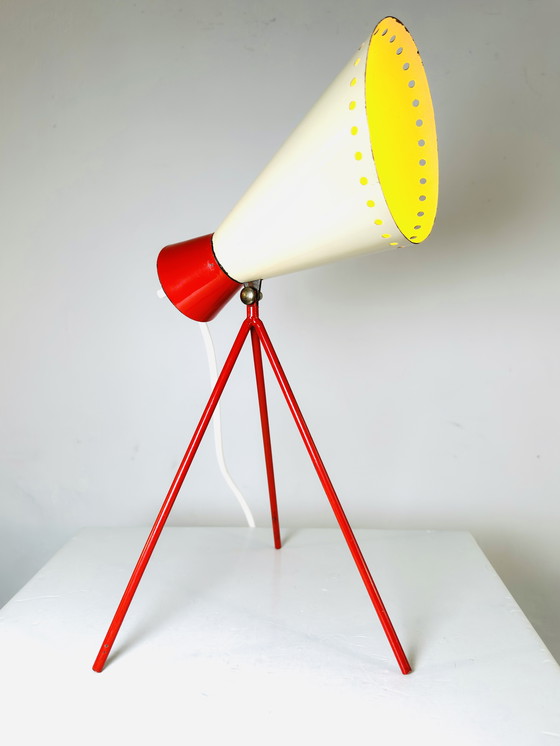 Diese ikonische Tischleuchte wurde 1954 von Josef Hurka für Napako entworfen und ist ein herausragendes Beispiel für tschechisches Design aus der Mitte des Jahrhunderts. Mit ihrem minimalistischen Dreibeinfuß aus Metall und dem auffallend kontrastierenden Schirm in Rot und Cremeweiß zeigt die Leuchte eine zeitlose Silhouette. Der perforierte Schirm erzeugt ein schönes, diffuses Licht, wenn er angestrahlt wird, und verleiht der Leuchte sowohl Funktion als auch Atmosphäre.