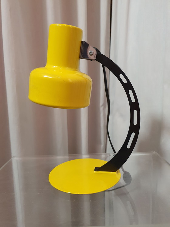 Ausgefallene Tischleuchte von Richard Essig/Besigheim, Modell 3240, aus den 1970er Jahren. Material Metall, Sockelplatte und Schirm Glanzlack leuchtend gelb, Verbindungsteil Seidenglanzlack schwarz, Gelenkverbindung zum Schirm verchromt.