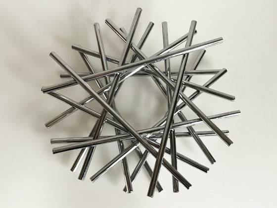 Sechs schöne Untersetzer aus massivem Edelstahl von Tommy Larsen. Ein schönes und effektives Design. Superschönes postmodernes dänisches Design. Durchmesser 19,5 cm und Höhe 2 cm.