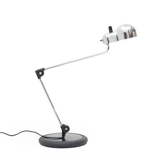 Die Topo, eine Ikone des italienischen Nachkriegsdesigns, ist an ihrem aerodynamischen, verchromten Metallschirm und dem Gelenkarm erkennbar, der eine präzise Lichtlenkung ermöglicht. Der beschwerte Fuß sorgt für Stabilität, während die kontrastierenden schwarzen Kunststoffgelenke Colombos unverwechselbare funktionale Ästhetik unterstreichen. Eine Leuchte, die Technik und Skulptur perfekt in Einklang bringt.
