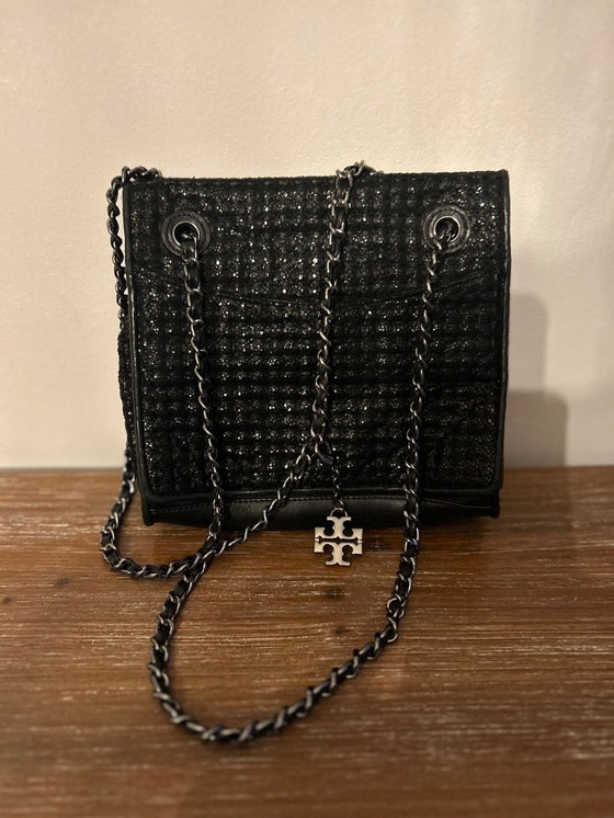 Verleihen Sie Ihrer Garderobe mit dieser wunderschönen Handtasche von Tory Burch einen Hauch von Luxus. Ihr elegantes Schwarz und die edle Metallkette machen sie zu einem vielseitigen Begleiter für Alltag und Abendveranstaltungen. Perfekt für die modebewusste Frau, die Wert auf Stil und Funktionalität legt. Gefertigt aus hochwertigem Leder, strahlt diese Tasche pure Klasse aus. Die robuste Metallkette dient als bequemer Schulterriemen, und ihre kompakte Größe ist ideal für Ihre wichtigsten Dinge. Nutzen Sie diese Gelegenheit und werten Sie Ihr Outfit mit einem Hauch von Eleganz auf!