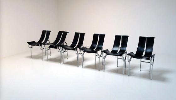 Diese Stühle sind extrem schwer zu finden, vor allem in einem großen Set wie diesem. Im Laufe der Jahre hat das Leder eine schöne Patina entwickelt, die den Charme und die Authentizität des Designs noch verstärkt.