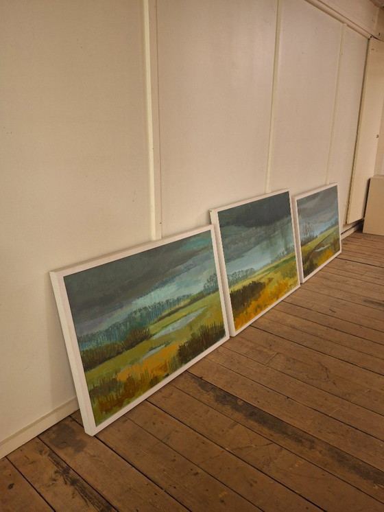 Triptychon mit dem Titel „Grienden“. Acrylmalerei. Signiert Jos van Dormolen, 1982. Wir haben dieses Werk aus dem Nachlass erworben.