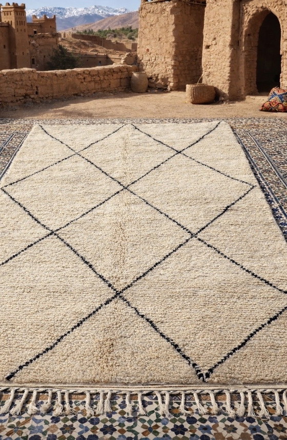 Dieser authentische, handgeknüpfte Teppich (296 x 198 cm) besteht aus hochwertiger Naturwolle auf einem robusten Baumwollgrundgewebe. Die sanfte Cremefarbe schafft eine warme, beruhigende Atmosphäre, während die eleganten schwarzen Linien – in Marokko als „Chebka“-Muster bekannt – Schutz, Verbundenheit und die Struktur des Lebens symbolisieren.