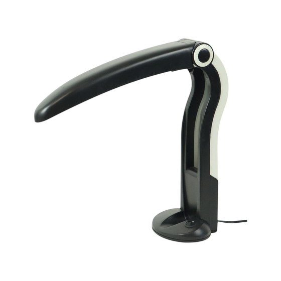 Seltene H.T. Huang für Huanglite Tischleuchte in Form eines Tukans, schwarz-weiße Farbkombination, Designobjekt der 1980er Jahre. Sehr begehrt bei Sammlern, sehr schönes Design, eine feine Leuchtstoffröhre ist im Schnabel versteckt, der sich öffnen und schließen lässt, Pop-Art-Design, dies war in verschiedenen Farbkombinationen erhältlich. Passt nahtlos in ein modernes oder Vintage-Interieur, sehr schön in einem Knderaum! Diese Lampe ist aus Hartplastik und hat eine 11-Watt-Leuchtstoffröhre. In sehr gutem Vintage-Zustand, mit nur geringen Alters- und Gebrauchsspuren wie einem winzigen Chip im Sockel, aber nichts Störendes, sehen Sie sich die Fotos für weitere Details an! Abmessungen: 38x13x35cm. Gewicht: 0,860 kg.