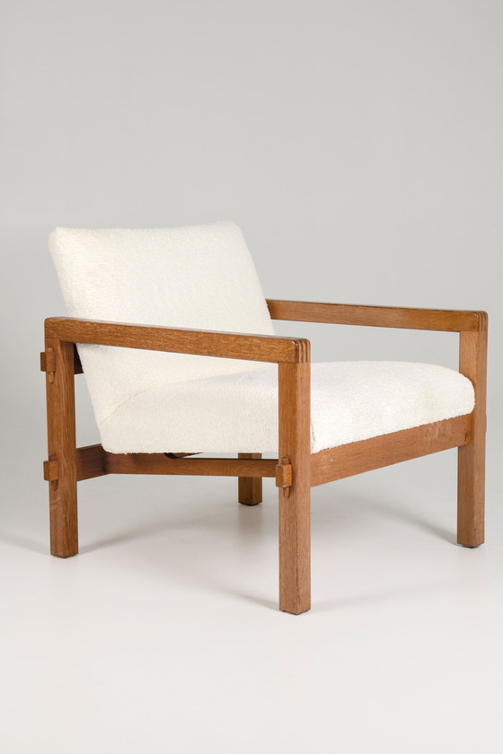 Für diesen Sessel wählte er ein Eichengestell, das im Laufe der Jahre eine angenehme Patina und leichte Gebrauchsspuren aufweist. Die Kissen wurden mit weißem Bouclé-Stoff neu bezogen. Unter dem Sessel befindet sich das Markenzeichen des Herstellers.