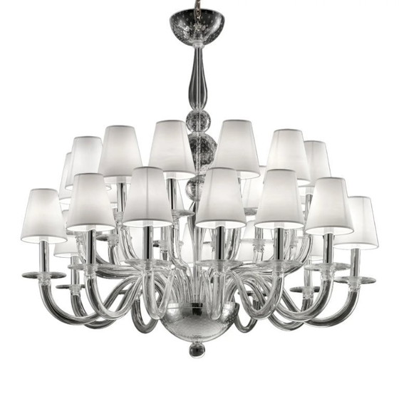 Eleganter Kronleuchter aus transparentem Muranoglas und verchromtem Metallgestell. Ein Meisterwerk italienischer Handwerkskunst für klassische und moderne Interieurs. Der Korpus ist mit Lufteinschlüssen versehen – eine traditionelle Technik der Muranoglasbläserei. Hergestellt in Italien, Versand aus Italien in einer Holzbox. Weiße Lampenschirme inklusive. Zwei Leuchtebenen mit je 12 Leuchtmitteln. Sehr helles Licht.
