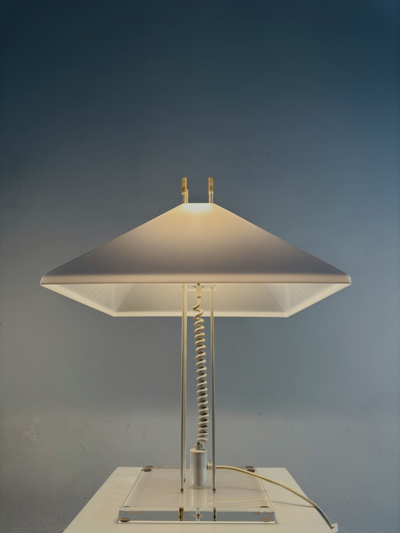 Das Design besteht aus einem großen quadratischen weißen Kunststoffschirm, der an vier Metallstiften aufgehängt ist, die in einer dicken Acrylfußplatte verankert sind. Eines der markantesten Merkmale der Lampe sind die vier spitzen Spitzen oben auf dem Schirm - Elemente, die bei anderen Exemplaren oft verloren gehen oder beschädigt werden, hier aber vollständig intakt und in schönem Zustand sind.