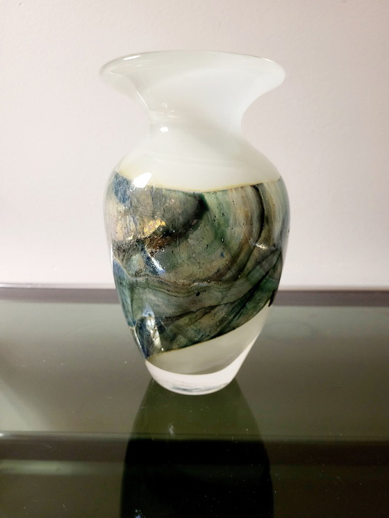 Val saint lambert Studio Cristal Vase, nummeriert SK L 1992, Lüttich, 1990er Jahre Schöne Glasvase, entworfen von Studio Cristal für Val saint Lambert in Lüttich. Produktion 1990er Jahre. Wunderschöne abstrakte Vase mit mehrfarbigen Akzenten und mattiertem weißem und klarem Glas als Hauptfarbe. Die Vase hat ein zeitloses Design und einen zeitlosen Charakter. Die Vase ist unten am Sockel mit Studio Cristal signiert und nummeriert und hat ein originales Fabriketikett. Abmessungen Höhe : 19,5 cm H x Durchmesser 10 cm (Hals)