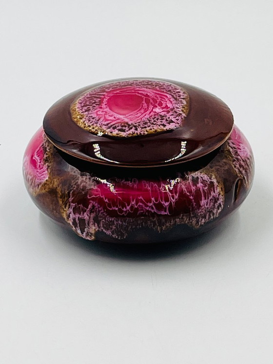 Entdecken Sie die zeitlose Eleganz dieser Bonboniere von Vallauris, einer exquisiten Kreation von Marius Giuge. Dieses Keramikmeisterwerk besticht durch seine faszinierenden Braun- und Rosatöne und verströmt einen Vintage-Charme, der Ihr Interieur bereichert.