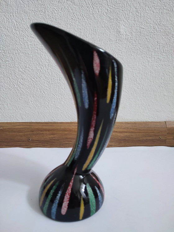 Diese einzigartige Vase aus den 1960er (oder 1950er) Jahren, bekannt als "Horn of Abundance", ist ein beeindruckendes Beispiel für das Design der 1960er Jahre. Die Vase ist aus Keramik gefertigt und hat eine auffällige schwarze Oberfläche mit bunten, abstrakten Mustern. Das Design ist sowohl künstlerisch als auch funktional und macht sie zu einer großartigen Ergänzung für jedes Interieur. Die Vase steht fest auf einem Sockel und eignet sich hervorragend zum Ausstellen von Blumen oder als alleinstehendes Dekorationsstück.