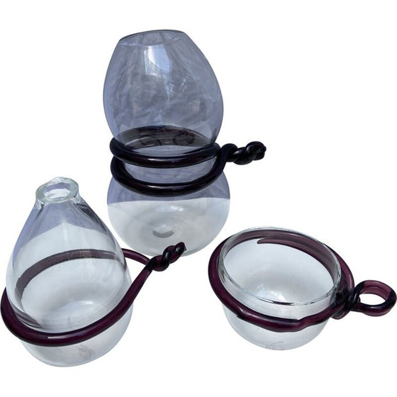 Kleines Vasen-, großes Vasen- und Becherset - Serge Mansau für MuranoKleine piriforme Soliflore-Vase (rauer Hals) aus Kristall: H13xT8Taschenbecher aus farbigem Kristall und Glied aus Parmakristall, bearbeitet mit Zange: H7xT11Große Vase mit Kürbis: H20xT131992