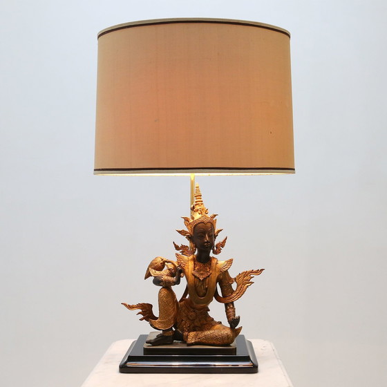 Frankreich 1860 / Tischlampe / Bronze, Holz / Asiatisch / Indisch / Vintage / Mid-Century / Antik / Regency Vergoldete Bronze, sitzender Buddha, Tischlampe aus der Rattanakosin-Periode. Die Figur aus vergoldeter Bronze ist auf einem geschwärzten Holzsockel montiert und weist einige schöne Details in der Kleidung und den Accessoires auf. Schöne Arbeit eines unbekannten französischen Dekorateurs aus den 1960er Jahren, im Stil der Maisons Charles und Jansen. Die Lampe ist sehr schwer und in gutem Zustand.