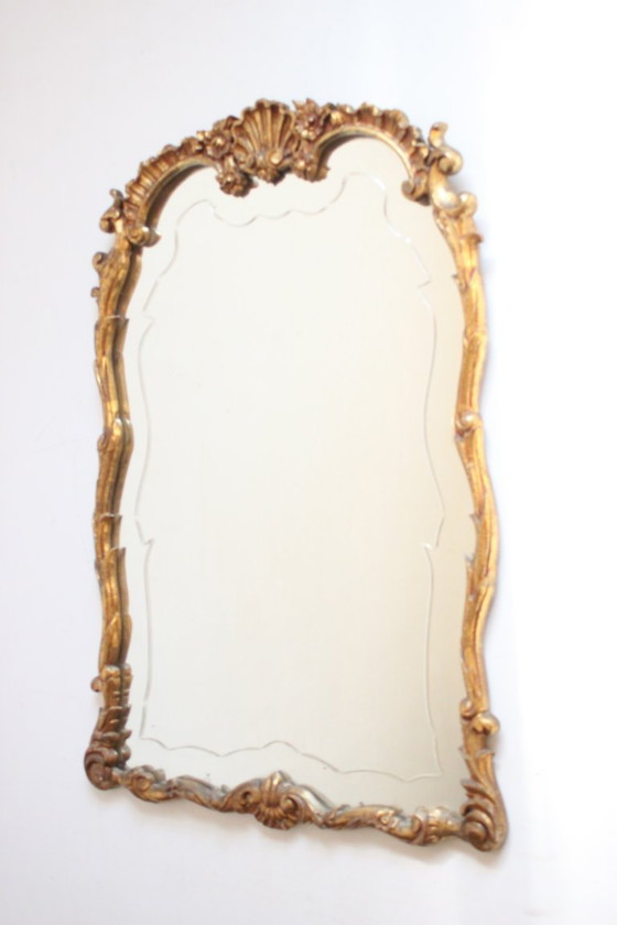 Antiker Neo-Rokoko-Wandspiegel aus dem 19. Jahrhundert mit einem vergoldeten, verzierten Rahmen mit Schnecken- und Muschelmotiven. Das Spiegelglas ist mit einem geätzten Zierrand versehen.