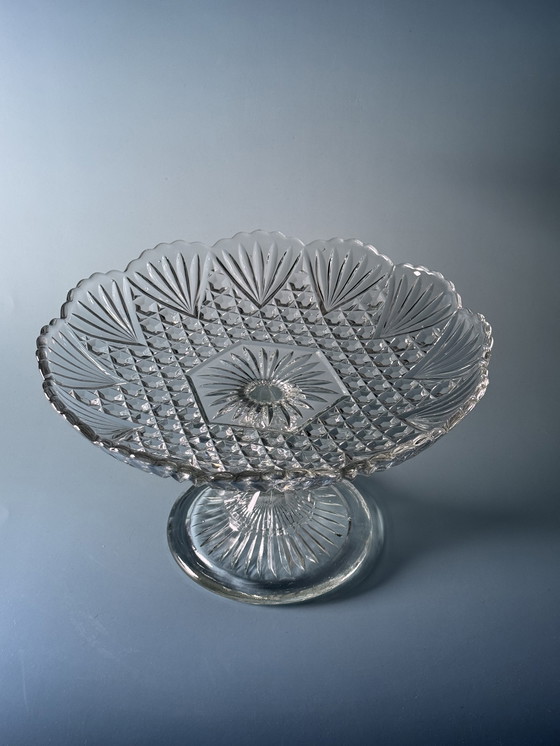 Es handelt sich um eine Schale aus gepresstem Kristall auf einem Fuß von Scailmont, Modell XL (28 cm breit), aus der Zeit des Art déco (1930). Das Stück weist komplizierte geometrische und fächerförmige Muster auf, die für die kühne und doch elegante Ästhetik der Epoche charakteristisch sind. Der Sockel und der gewellte Rand unterstreichen das raffinierte Erscheinungsbild und machen die Schale sowohl zu einem funktionalen Servierstück als auch zu einem dekorativen Gegenstand.