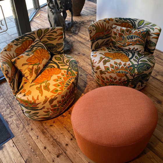 Verzelloni Emily fauteuil (set van 2) met poef Dankzij de compacte afmetingen en geïnspireerd door de omhullende vorm van een schelp, vertegenwoordigt fauteuil Emily de ideale combinatie van comfort en elegantie, en past hij sierlijk in zowel woon- als openbare ruimtes. Het frame van de rugleuning is van metaal opgevuld met verschillende dichtheden polyurethaan, het frame van de zitting is van massief hout en multiplex opgevuld met verschillende dichtheden polyurethaan. Unieke custom stoffering is van krachtige mooie print stof. 2x stoelen: H71 x B79x D64 cm + zithoogte 42 cm 1x poef: H42 x B72x D75 cm