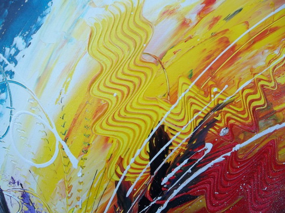 Vesuvio ist ein abstraktes und explosives Werk, in dem die Farben wie ein Ausbruch des Lebens hervorbrechen. Im Herzen der Komposition strömt ein Wirbelwind aus Weiß-, Schwarz-, Blau- und Lilatönen in schillernder Bewegung hervor, umgeben von leuchtendem Rot, sonnigem Gelb und leuchtendem Türkis. Geschwungene und zickzackförmige Linien durchziehen die Leinwand und betonen die Energie und das kontrollierte Chaos dieser Vulkanszene.