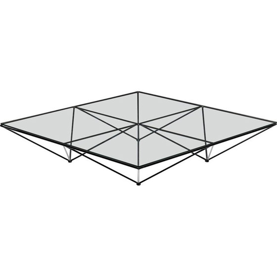 Alanda Couchtisch von Paolo Piva für B and B Italia. Eines der berühmtesten Stücke des italienischen Designers Piva, auch "Pyramidentisch" genannt. Dieses originelle Design, das in den 1980er Jahren berühmt wurde, ist ein Zeugnis für Pivas einzigartige Vision und seinen Stil. Der quadratische Couchtisch Alanda mit seinem schwarz lackierten Stahlgestell hat eine besonders helle Glasplatte, die ihm einen Hauch von Eleganz und Raffinesse verleiht. Die Struktur von Alanda, die sowohl als Sockel als auch als Stütze dient, erinnert an eine Gruppe von umgedrehten Pyramiden, ein geodätischer Rahmen, der ihn seit jeher als magisches Objekt charakterisiert, das kosmische Energie einschließt und verstärkt. Sein originelles Design und sein ikonischer Status machen ihn zu einem Statement, das alle, die ihn sehen, beeindruckt und inspiriert. Mit dem Couchtisch Alanda bringen Sie einen Hauch von kosmischer Energie in Ihr Zuhause und schaffen einen Raum, der sowohl funktional als auch schön ist.