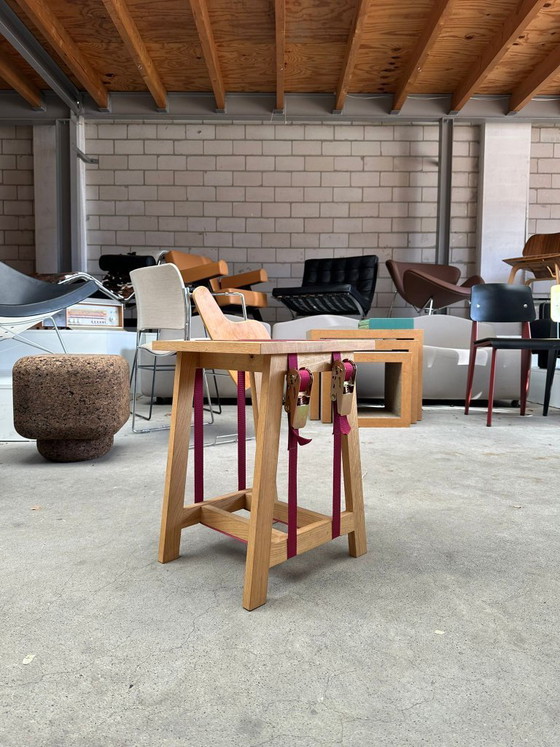 Erleben Sie die perfekte Kombination aus modernem Design und Funktionalität mit dem Vij5 Strap Stool, entworfen vom talentierten Designerduo Bram Burger und Stijn van der Vleuten. Dieser Hocker ist ein Meisterwerk der Handwerkskunst: Seine robuste Holzkonstruktion und die markanten roten Riemen verleihen ihm eine verspielte und zugleich strukturgebende Note. Ideal für minimalistische oder industrielle Einrichtungen, bietet dieser Hocker Vielseitigkeit und Stil. Gefertigt aus hochwertigem Holz und ausgestattet mit stabilen Metallschnallen, garantiert er Langlebigkeit und einen zeitgemäßen Look. Verleihen Sie Ihrem Raum mit diesem einzigartigen und stilvollen Hocker einen Hauch von Modernität. Einzeln erhältlich, 2 Stück verfügbar.