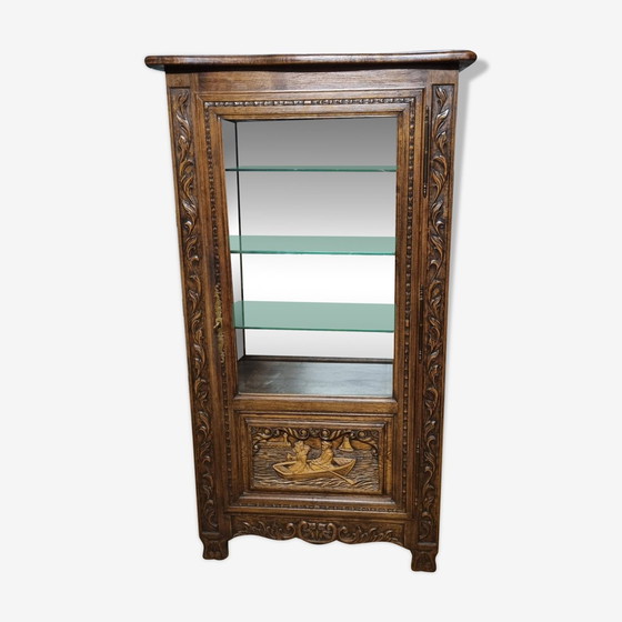 Vitrine aus geschnitztem Eichenholz, handgeschnitztes bretonisches Möbelstück aus den 50er und 60er Jahren, mit einer Glastür mit Bronzebeschlag und Schlüssel, 3 dicken Glasböden (kleine Pünktchen auf einem davon kaum sichtbar), der Boden des Möbelstücks mit einem Spiegel, um die Gläser und anderes Silber zu reflektieren, das dort gelagert wird.