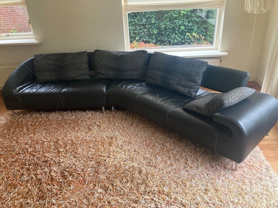 Deze iconische zwarte hoekbank is de aanbieding wegens verhuizing naar een kleiner stulpje. Inclusief een bijbehorende hocker/poef (110x120 cm) en twee Leolux tafeltjes.