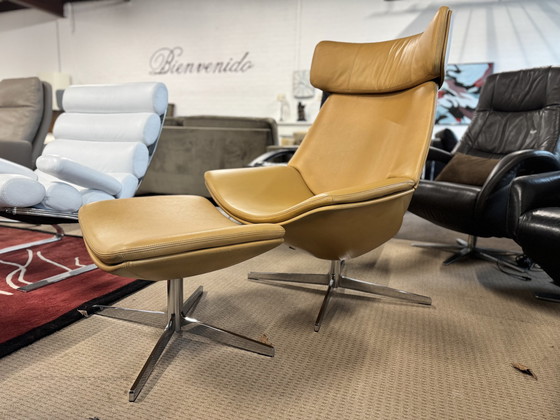 Design Ikone von Walter Knoll ein Einzelstück das man sehr selten zu Gesicht bekommt .Sessel ist in geschmeidigem Leder in der Farbe Sand ausgeführt .ein Eyecatcher . Ein einfacher Knopf an der Seite steuert die Schale, indem er in eine bequeme Liegeposition fährt.