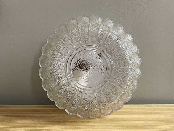 Hergestellt aus strukturiertem Glas und weiß lackiertem Aluminiumsockel.