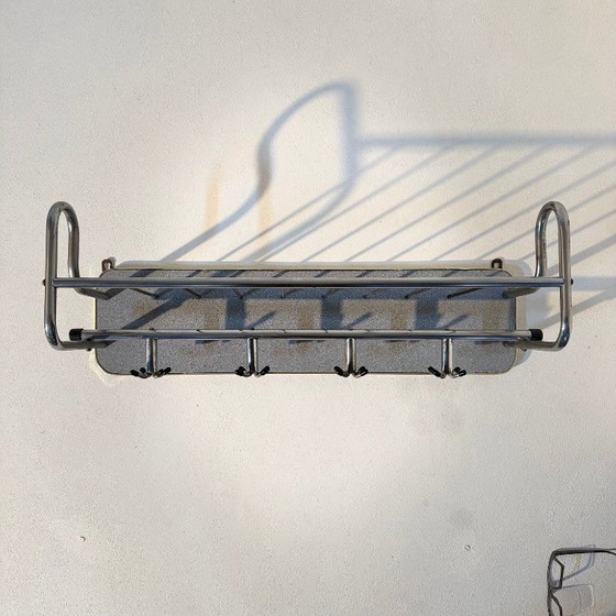 Garderobenständer aus den 1950er-Jahren, verchromt mit hellgrau gesprenkelter Wandplatte und Hutablage. Der Garderobenständer verfügt über vier Haken mit jeweils vier Haken und bietet somit Platz für viele Mäntel.
