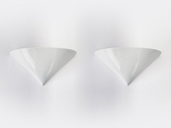 Angeboten werden diese zwei wunderschönen, minimalistischen Wandleuchten aus weißem Metall.